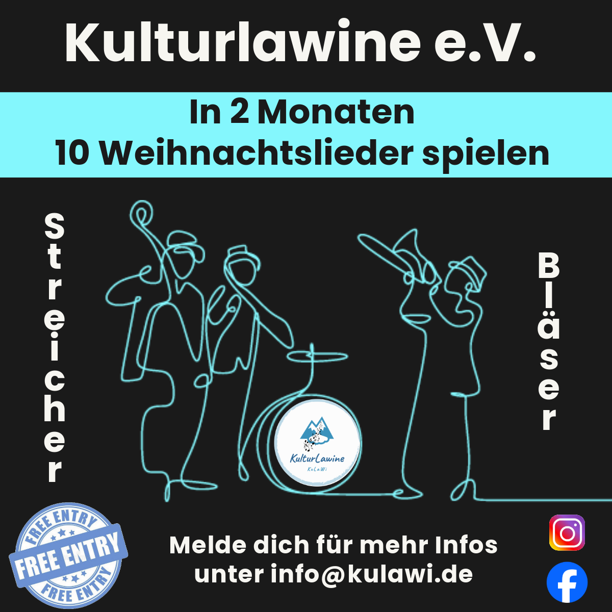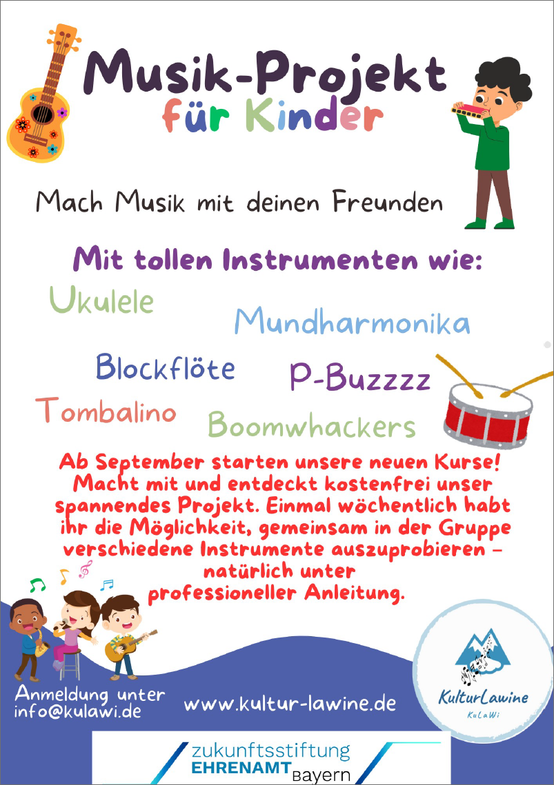 Wer dabei auf den Geschmack kommt, ist herzlich eingeladen, selbst Teil der Kulturlawine zu werden. Anfängergruppen bieten derzeit allen, die schon immer ein Instrument lernen wollten – egal in welchem Alter – die Gelegenheit zum Einstieg. Auch der Kulawi-Chor freut sich über neue Mitglieder – ob erfahrene Sängerinnen und Sänger, Anfänger oder solche, die einfach Freude am gemeinsamen Singen haben.